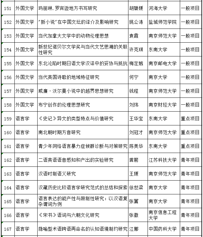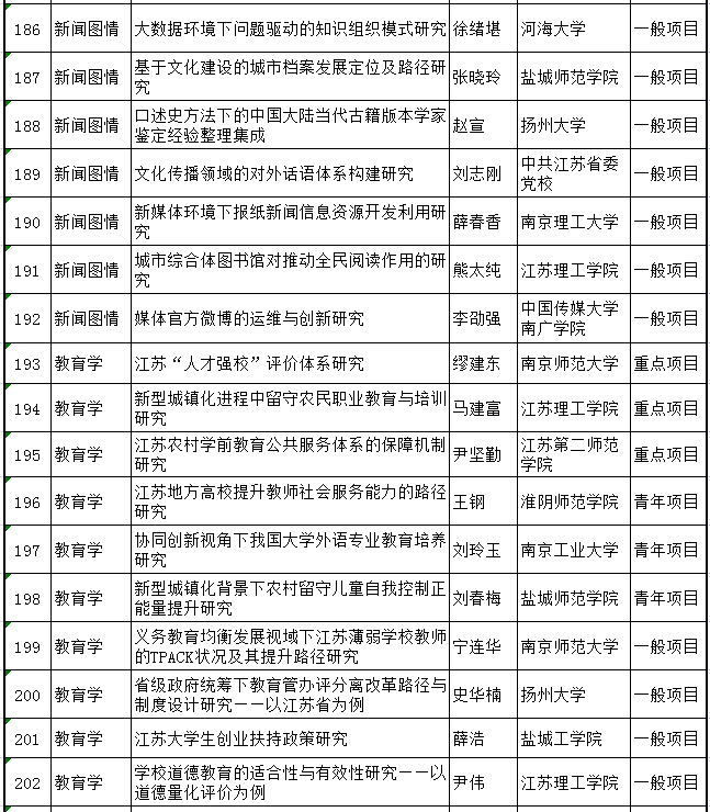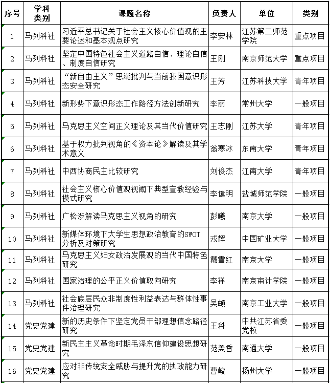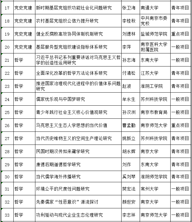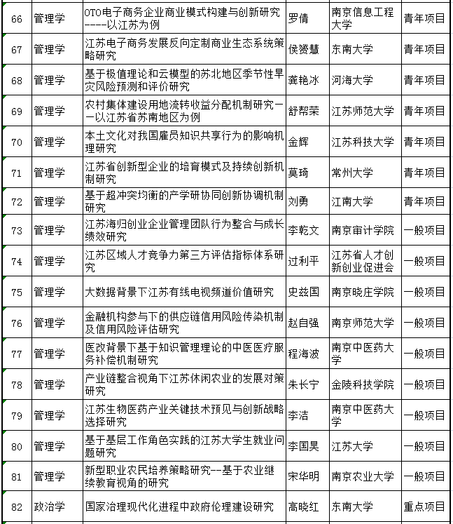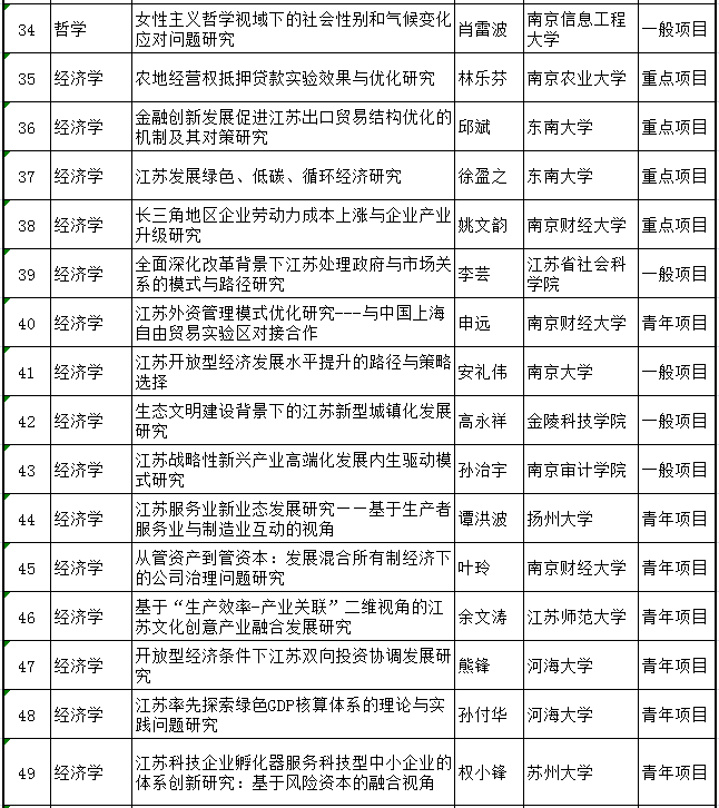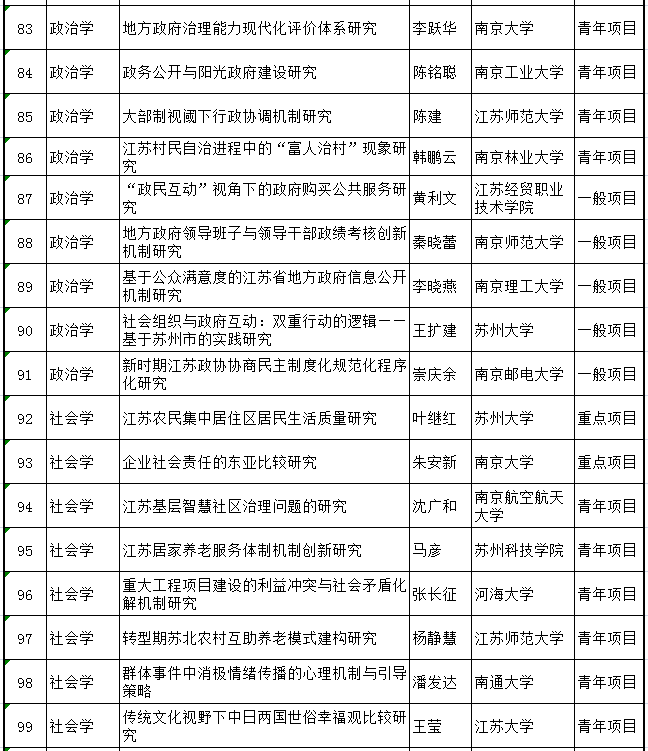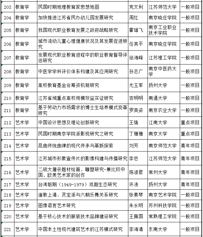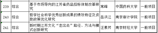 今年全省申报课题3008项,经审核,正式受理2944项。其中,重点项目233个,一般项目1649个,青年项目1062个。此次公布的年度项目立项总数为241项,平均立项率为8.2%。其中,重点项目31项,每项资助6万元;一般项目136项,青年项目74项,资助强度均为4万元。项目分布涉及全省56所高校、党校、科研院所。立项数超过10项的包括:南京大学、东南大学、南京师范大学、江苏师范大学、扬州大学。