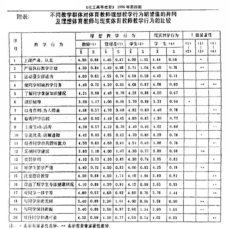 将教师组对自身教学行为在教学工作中所占比重的期望值作为模式,与员工组对现在的体育教师教学工作情况的判断进行比较后表明在所列的20项教学行为中有9项有显著差异。(见附表)