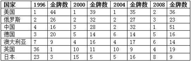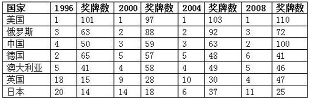 2.对另一些国家而言,体育实力与GDP的联系就不那么紧密了。代表国家是俄罗斯和日本。近十多年里,俄罗斯的GDP一直在10名之后,可它在金牌榜和奖牌榜上稳稳地停留在二三名的位置,其军事实力也是世界公认的老二。日本刚好与之相反,GDP长期居于世界第二,但奥运会的金牌榜和奖牌榜则在4-10名之间浮动,显得极不稳定。军事实力也难以琢磨,表面的军事实力受限于战败条约,其军事潜力却是不可估量的。