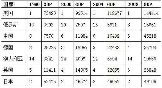 战争实力是一国综合国力的体现,而综合国力是衡量一个国家基本国情和基本资源最重要的指标。如何界定和衡量一个国家的综合国力,国际上还没有统一的定义和计算方法。本文姑且选择能基本代表国力的GDP来进行比较。虽然在统计方法、计算公式、汇率影响等方面存在争议,但每年世界各国的GDP排行榜还是权威得让很多人睡不着觉。