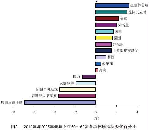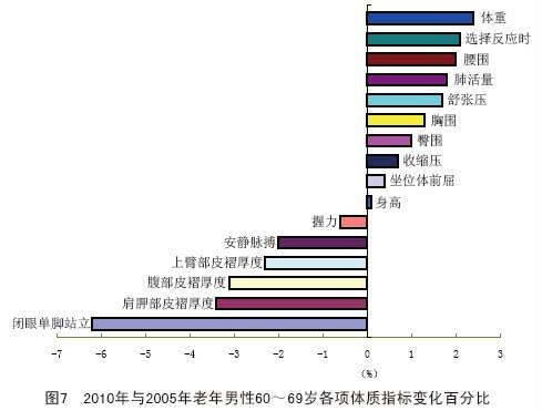 与2005年相比,2010年60~69岁老年男性的身高、体重、胸围、腰围、臀围、收缩压、舒张压、肺活量、坐位体前屈、选择反应时等指标有所提高,幅度在0.1%~2.4%之间;皮褶厚度(上臂部、肩胛部、腹部)、安静脉搏、握力、闭眼单脚站立等指标有所降低,幅度在0.6%~6.2%之间(图7)。