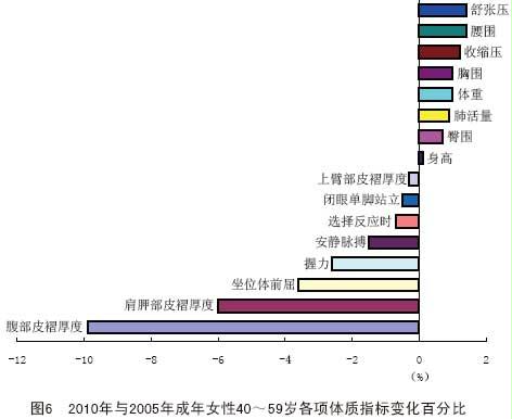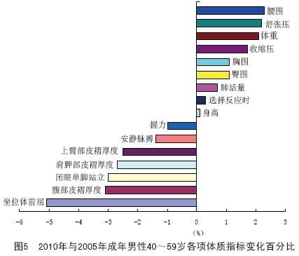 与2005年相比,2010年40~59岁成年男性的身高、体重、胸围、腰围、臀围、收缩压、舒张压、肺活量、选择反应时等指标有所提高,幅度在0.1%~2.3%之间;皮褶厚度(上臂部、肩胛部、腹部)、安静脉搏、握力、闭眼单脚站立和坐位体前屈等指标有所降低,幅度在1.0%~5.1%之间(图5)。