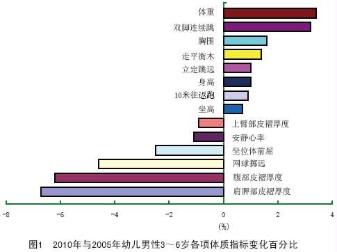 与2005年相比较,2010年3~6岁幼儿的身高、体重、坐高、胸围、10米往返跑、立定跳远、走平衡木、双脚连续跳等指标有所提高,男性提高幅度在0.7%~3.4%之间,女性在0.7%~3.7%之间。皮褶厚度(上臂部、肩胛部和腹部)、安静心率、坐位体前屈、网球掷远等指标有所降低,男性降低幅度在0.9%~6.7%之间,女性在0.1%~7.4%之间(图1、图2)。