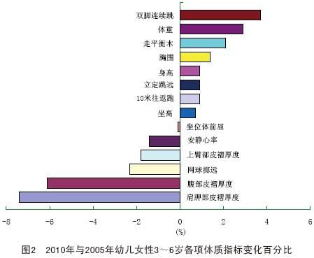 2010年,幼儿多数年龄组的大部分身体素质指标略高于2005年的水平。自2000年以来,我国幼儿身体素质总体呈持续增长趋势。