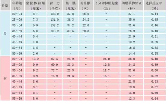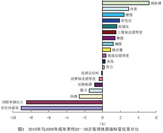 反映力量耐力的俯卧撑和1分钟仰卧起坐等指标的平均数,自2000年以来,呈持续增长趋势。2010年,成年人的身体素质中的握力、背力、坐位体前屈等指标平均数略低于2005年,更低于2000年,呈持续下降趋势;纵跳、闭眼单脚站立、选择反应时等指标平均数则低于2005年,高于2000年。