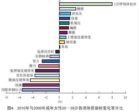 女性的身高、体重、胸围、腰围、臀围、上臂部皮褶厚度、收缩压、舒张压、肺活量和1分钟仰卧起坐等指标有所提高,幅度在0.1%~8.0%之间;肩胛部皮褶厚度、腹部皮褶厚度、安静脉搏、握力、背力、纵跳、闭眼单脚站立、坐位体前屈和选择反应时等指标有所降低,幅度在0.6%~5.6%之间(图4)。