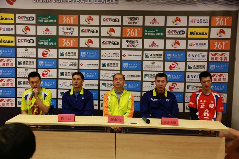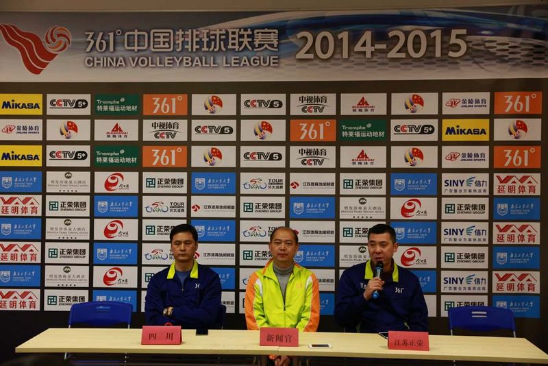361°中国男子排球联赛(2014-2015)第二阶段第十一轮第62场江苏正荣男排主场迎战四川男排的比赛在太阳成集团tyc234cc体育馆如期举行,双方经过紧张激烈的争夺,江苏正荣以3:1的比分战胜四川男排。赛后双方主教练和队长对比赛分别进行了点评。
