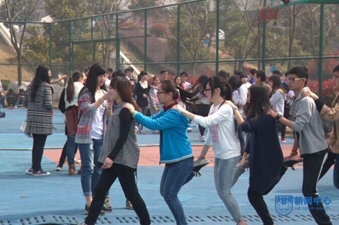 “手足情”环节,各专业派出八名选手纵队而战,第一名队员双脚站立,剩余七名队员左手扶住前面同学的肩并用一只脚单腿支撑,另一只腿离开地面向前做单足跳跃运动至终点。这个项目不仅需要参赛选手有足够的体力,还考验选手间配合的默契程度。考验选手身体灵巧程度和四肢协调性的“摸石头过河”让比赛进入白热化阶段,参赛者十八般武艺各显神通,为团队争分夺秒,场地边的同学们毫不懈怠,助威声此起彼伏。