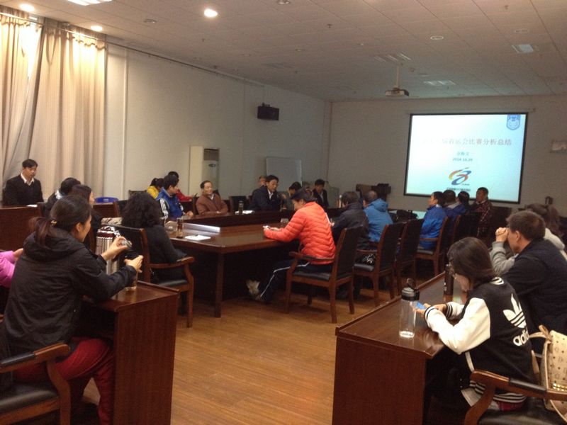 首先,由体育部运动队管理中心主任佘海文老师全面总结和回顾了公司参加江苏省第十八届运动会(高校部)比赛情况。佘海文主任以精制PPT的形式,从“里程碑回顾、历史经验总结、省运会比赛数据分析、展望下一届省运会”等四个方面,向全体教职工讲述了公司备战十八届省运会的历程,通过对十七届和十八届省运会公司各运动队得分相关数据对比分析,以及公司高水平运动队和普通生运动队得分贡献度对比分析,很直观地反映了公司“坚持从三个层次建设运动队、坚持走竞技体育和群众体育协调发展、坚持全面动员,全面组队参与决策”的正确性,同时通过与十八届团体总分前三名省内高校进行对比分析,发现了公司体育还存在的明显劣势和兄弟高校优势所在。通过与主要竞争者的几所兄弟高校进行对比分析,找出了他们在本届备战上存在不足及下届可能给公司带来的挑战。这种来自实践以后的认真反思和全面总结,给全体教职工起到了示范性作用,再一次告诉大家工作后的总结的必要性,可以从中寻找和归纳出一些规律性的东西和成功经验,以便更好地指导今后工作。