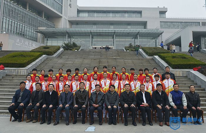 在会议召开前,领导与校江苏女垒全体人员合影留念。(来自体育部)