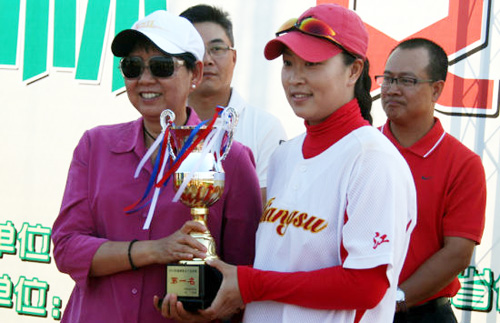 图为手曲棒垒中心副主任江秀云为南工大江苏队(蔡协清)颁发奖杯