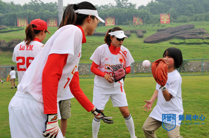 具有国家女子垒球队和公司江苏女子垒球队双重身份的运动员王兰和李欢在辅导孩子练习击球
