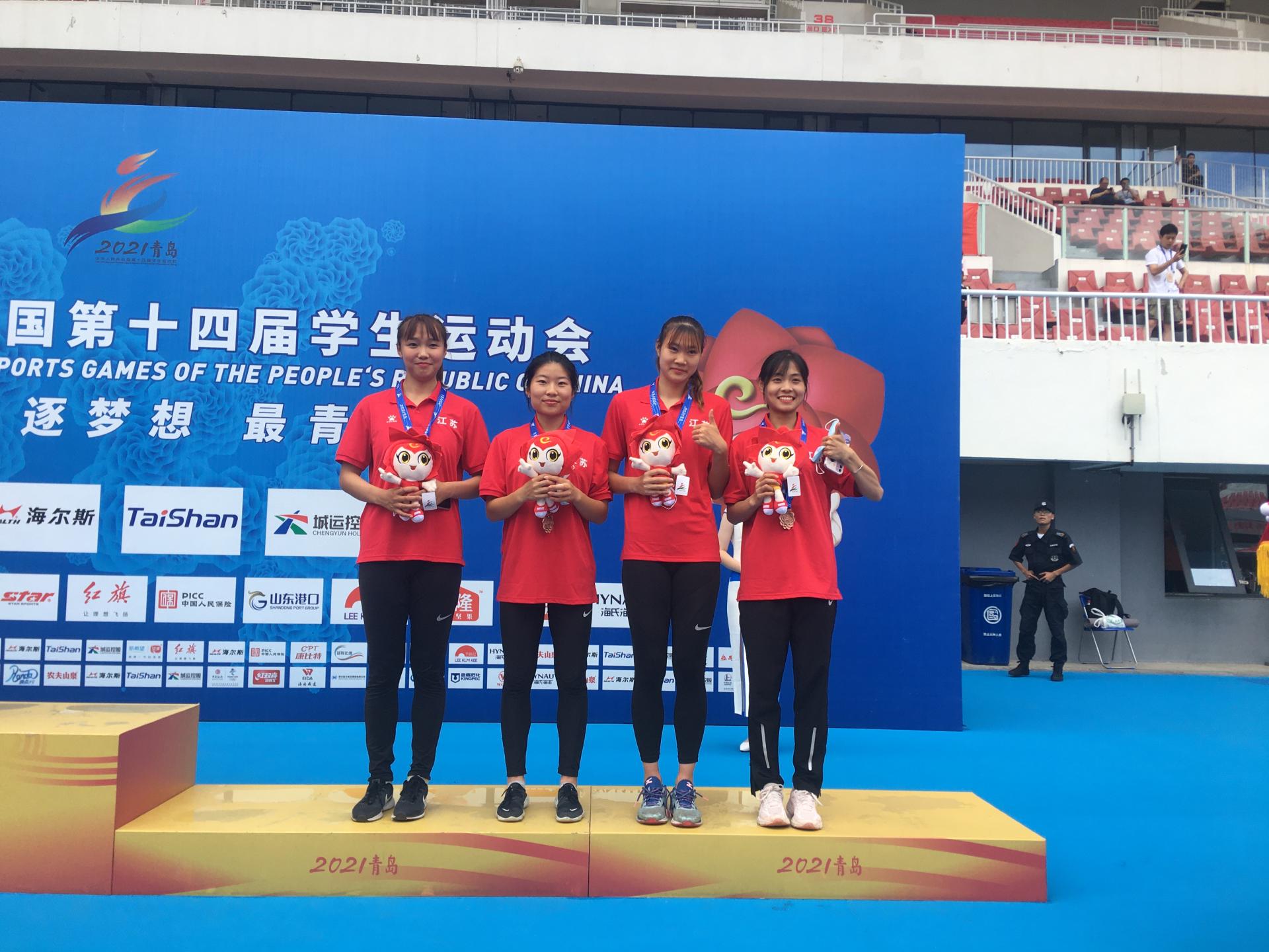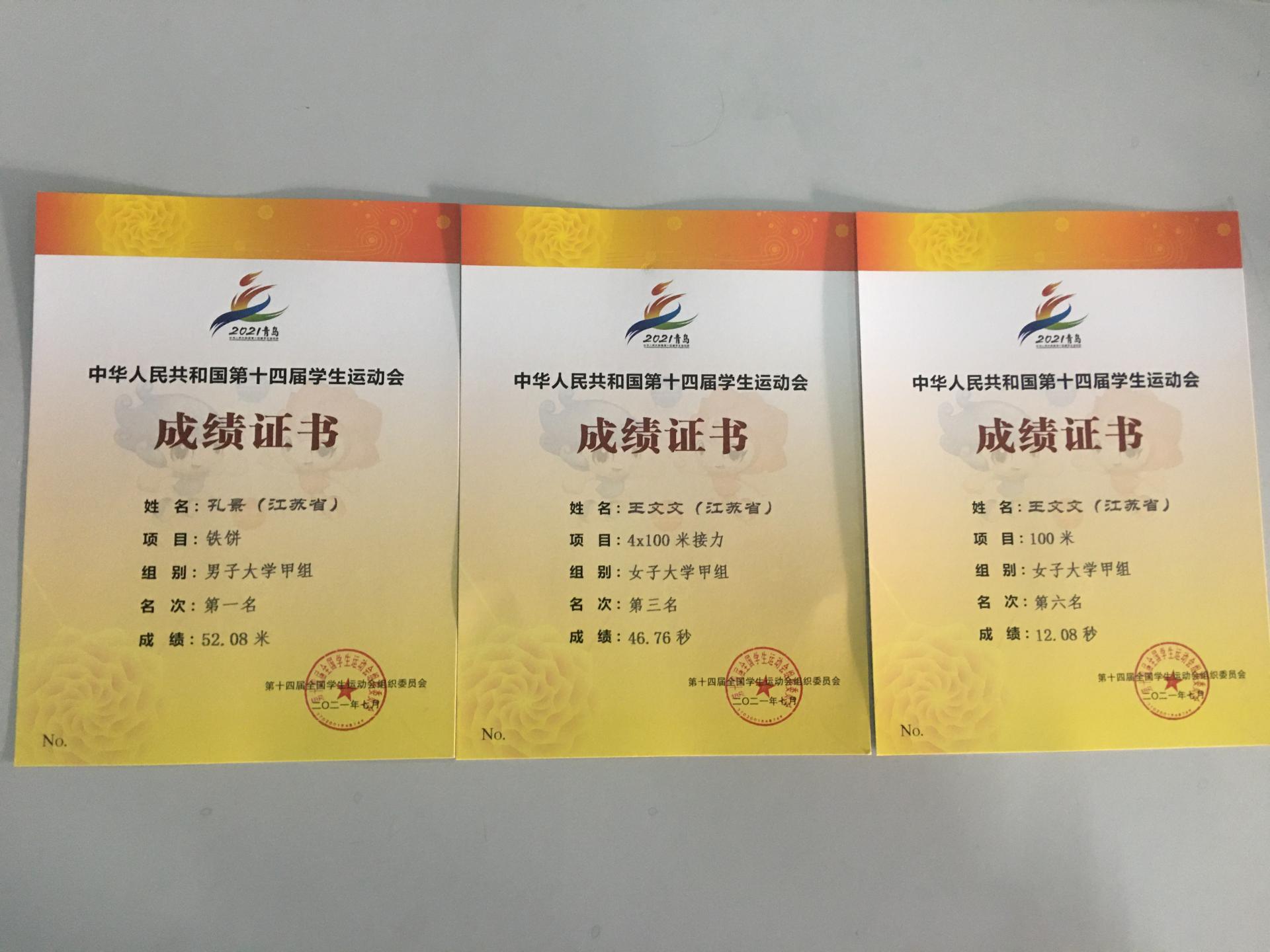 7月14日一17日,第十四届全国员工运动会在青岛举行。在太阳成集团tyc234cc教练员於鹏和李海兵两位老师的带领下,经济管理公司孔景和王文文两位同学代表江苏省参加了大学组田径项目的比赛,经过奋力拼搏,孔景同学勇夺男子甲组铁饼金牌,王文文同学荣获女子甲组4x100米接力铜牌和女子甲组100米第六名,圆满完成学运会任务。
