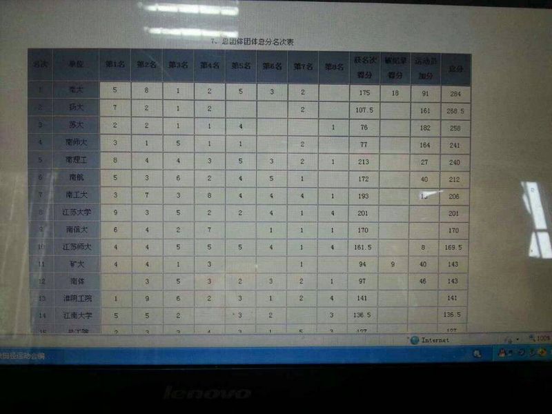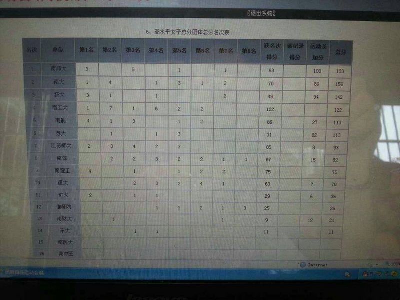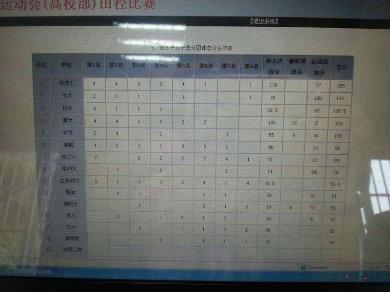 5月15日至18日,由江苏省教育厅、江苏省体育局主办,江苏省员工体育协会高校工作委员会协办、南京航空航天大学承办的江苏省十八届运动会田径赛在南京航空航天大学江宁校区举行,校员工田径队员在领队侯佳明,主教练於鹏,教练员李海兵和张铭老师的潜心带领下,经过四天的紧张拼搏,顺利地完成了全部比赛任务,最终取得了男子团体总分84分,名列全省高校第七名,女子团体总分122分,名列全省高校第四名,男女团体总分206分,名列全省高校第七名,进入了第一方阵,同时荣获了“体育道德风尚运动队”称号。这是公司田径队首次在全省运动会田径赛中进入前八名,创造了历史最好成绩,为公司争取了荣誉,让我们向教练员和田径健儿们表示热烈祝贺和衷心感谢。(来自体育部)