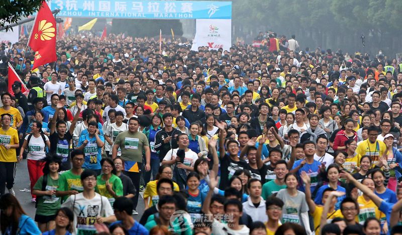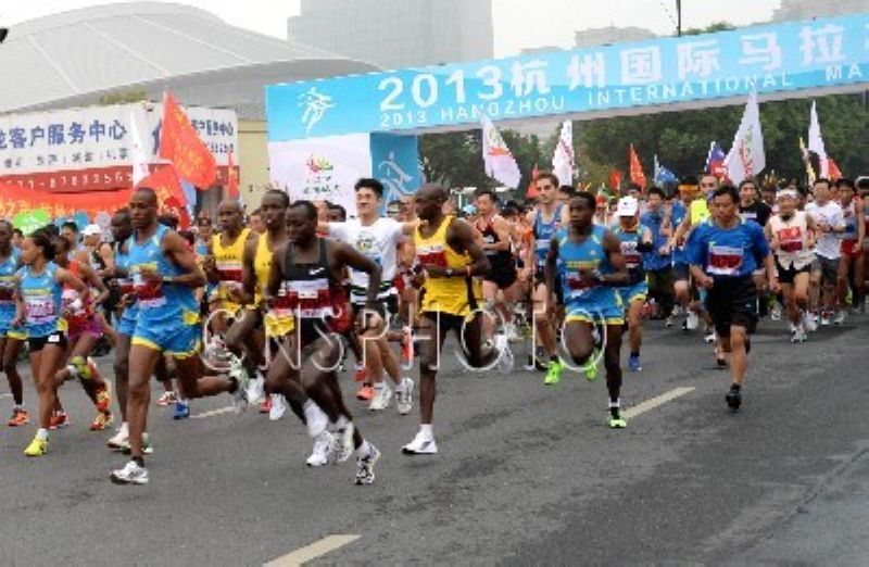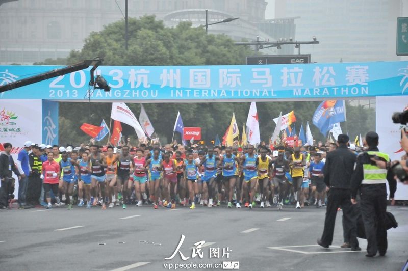 2013杭州国际马拉松于11月3日(周日)上午8时在黄龙体育中心东广场鸣枪开跑。经过26年发展,杭州国际马拉松赛已成为中国田联和国际马拉松及路跑协会(AIMS)备案的国际级马拉松赛事,是中国最重要的马拉松赛事之一。今年报名人数再创新高,一共吸引了来自肯尼亚、日本、美国、韩国、芬兰、法国、丹麦、马来西亚及中国台湾、中国香港、中国澳门等26个国家和地区约25000人参赛,年龄最大的参赛者70岁,最小的7岁。