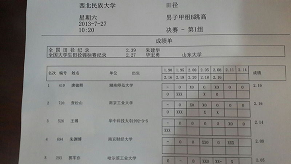 7月27日上午在西北民族大学主体育场进行了男子甲组B跳高决赛的争夺,经过高度1.95米、2.00米、2.05米、2.08米、2.11米、2.14米、2.16米、2.18米、2.16米九轮激烈角逐,最终来自湖南师范大学唐敏熙凭借有效过杆率以2.16米夺得桂冠,公司查松山同学则凭借2.16米的成绩赢得亚军,华中科技大学王博则以2.14米的成绩的获季军。虽然没有获冠军,不过查松山同学已经很好地完成了教练赛前布置2.15米高度任务,其本人在赛场上颇具大将风度,显得宠辱不惊,在场上面带微笑地和几位老对手不时进行着交流,展现了一名成熟队员在比赛场上从容淡定的自信!赛后其坦言:“今天只能算是稳定发挥,从此我不在怀疑自己能力,当运动员要有霸气和决心,个人下一个目标争取突破2.20米”!
