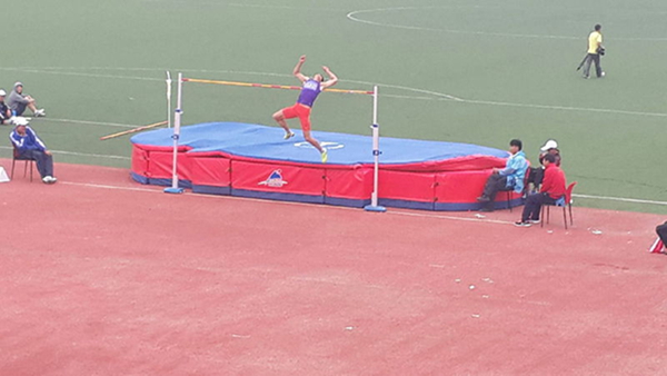 男子甲B组跳高决赛上,校田径队员查松山赢得亚军