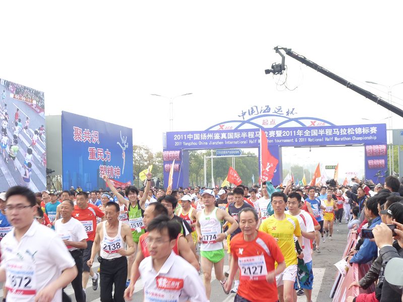 4月24日 上午8时整,中国扬州鉴真国际半程马拉松赛鸣枪开跑。在现场数万观众的助威下,来自埃塞俄比亚、肯尼亚、美国、英国、德国、日本等四十个国家和地区的近3万名选手参赛,其中外国选手230多人,全国参赛高校近90所,俱乐部团体约240个。他们在震天的欢呼声中冲出赛场,参赛运动员从扬州广陵新城起跑,至新城西区双博馆结束,沿线把扬州东西两座新城的现代化成就,与千年古城的历史文化有机地连接在了一起,充分彰显了扬州“人文、生态、精致、宜居”城市特色。扬州是鉴真大师故里,从2006年以来,每年举行以鉴真为赛事品牌核心元素的马拉松赛事,已成功举办了五届,这是中国唯一以人名命名的马拉松赛事。今年是第六届,也是被列为国际田联“银标”赛事的首场赛。经过激烈角逐,最终,埃塞俄比亚选手DERIBA MERGA EJIGU 以1小时01分10秒的成绩摘得男子组冠军,同时破赛会纪录;女子组埃塞俄比亚选手MARE DIBABA HURSSA以1小时09分41秒的成绩夺得第一 。