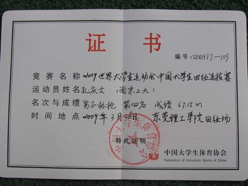 由中国老员工体育协会主办,中国老员工体育协会田径分会协办,东莞理工公司承办的2009世界老员工运动会中国老员工田径选拔赛,于3月28日至29日在广东东莞理工公司举行,参加本次田径选拔赛的共有来自全国44所高校。公司田径队标枪运动员、管理工程公司工程管理专业09级孔庆文同学在领队於鹏老师和教练张铭老师带领下,参加了本次的比赛,经过激烈争夺,以67.15米名成绩获得了男子标枪第四名,这是公司老员工运动员在全国性的比赛中,又一次取得的优异成绩。