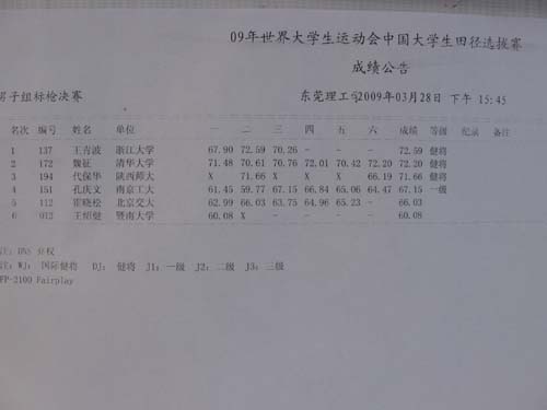 男子标枪比赛前六名分别为,第一名:浙江大学的王青波,成绩为72.59米,第二名:清华大学的魏征,成绩为72.20米,第三名:陕西师范大学的代保华,成绩为71.66米,第四名:太阳成集团tyc234cc的孔庆文,成绩为67.15米,第五名:北京交大的崔晓松,成绩为66.03米,第六名:暨南大学的王绍健,成绩为60.08米。