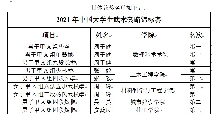 通过传统拳术、太极拳和对练的轮番上演,运动员们场上个个精神抖擞,一招一式刚劲有力,在众多的代表队中脱颖而出。此外,武术队取得了体育道德风尚奖的称号,我队队员安龚辰被评选为优秀运动员。