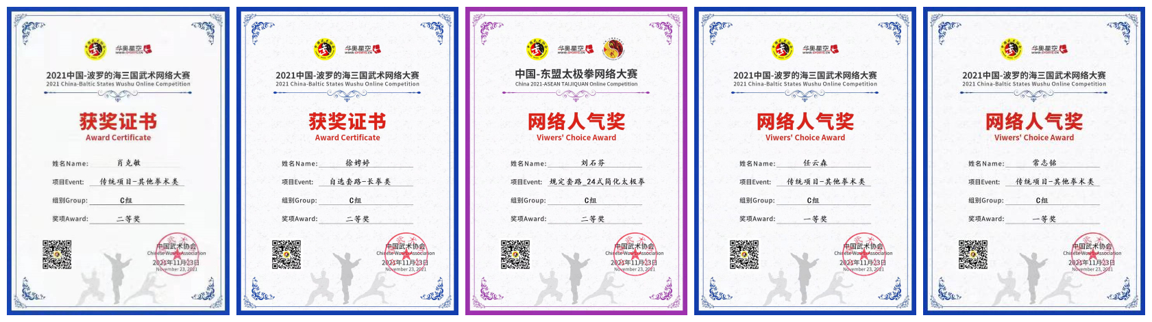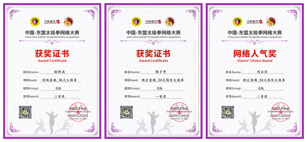 校国术俱乐部的4位同学参加了中国-东盟太极拳网络大赛,在裁判评判中陈子华同学获规定套路-24式太极拳裁判评判一等奖,徐梓函、王小如、刘石芬等三位同学获三等奖,网络人气二等奖2人,三等奖2人。