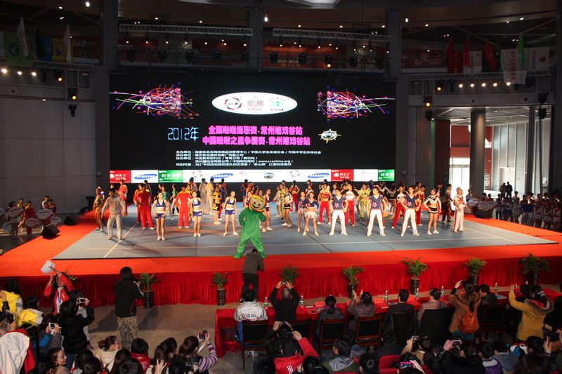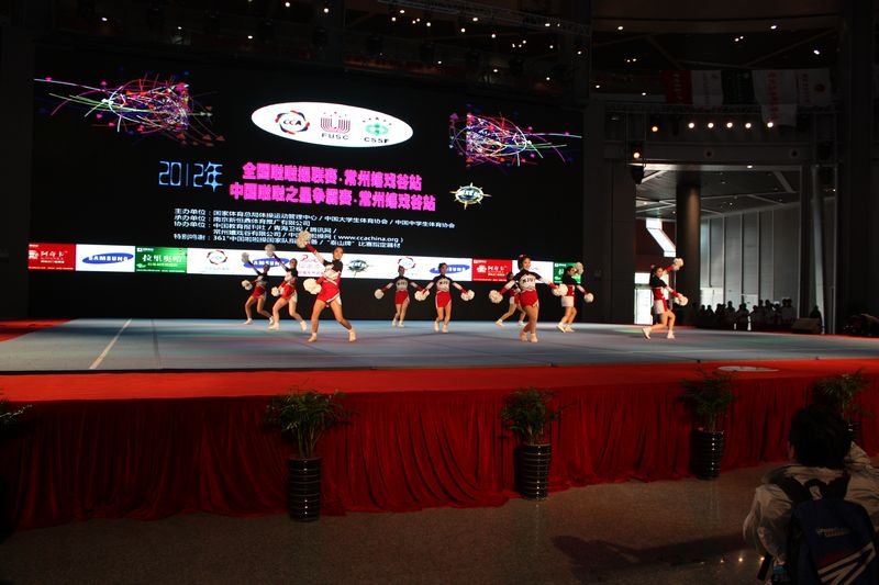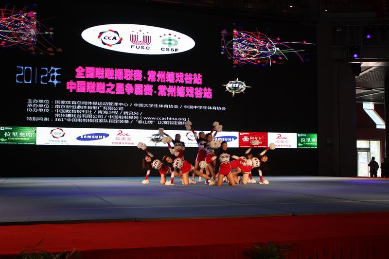 全国啦啦操常州分站赛于11月23日—25日在常州嬉戏谷举行,由李双辰等22名同学组成的公司啦啦队,在体育部薛敏、张海涛二位老师带领下,参加了本次比赛,最终获全国啦啦操比赛常州嬉戏谷站大学组“花球规定套路、二级花球自编套路、二级技巧规定套路”等三个项目的第一名,薛敏老师和张海涛老师获优秀教练员奖,队员吴刚和唐梦娇成为了全国比赛常州站的啦啦操之星,同时校啦啦操队获道德风尚奖。在短短几天里,队员们领略并学习到了对手精湛的啦啦操技巧,更重要的是体验到了从未有过的集体荣誉感。