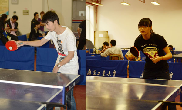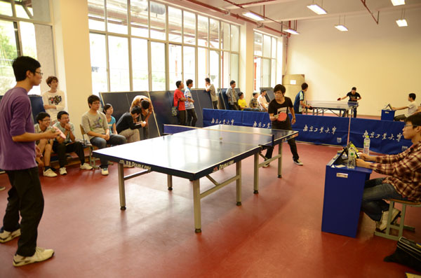 比赛开始后,随着白色小球在乒乓球桌上的飞动,各个院的选手们将他们的水平发挥得淋漓尽致,用娴熟的技术和坚持不懈的精神将比赛推至高潮。只见这边的男选手刚刚得到了一分,对方的同学也毫不示弱地扳平一分,双方选手在比分上的追赶使比赛变得更加紧张刺激。前一刻,我们看到球台一侧的选手用力量型扣球将球杀到对方桌面上,在下一刻,球台另一侧的选手马上用旋转式回球将球打回对方面前。在这个扣人心弦的时刻,不仅场上的选手们在专心致志地比赛,使出浑身解数,争取得分。聚集在一旁的同学们也在十分卖力地呐喊助威,赛场上加油声此起彼伏。选手们在拉拉队的呐喊声下,士气得到了鼓舞,快速地抽杀击球,使得比赛变得更加激烈、更加精彩。选手们挥洒着汗水,在坚定信念的支撑下实践着体育精神,那份坚定与执著令在场的所有人感到震撼。