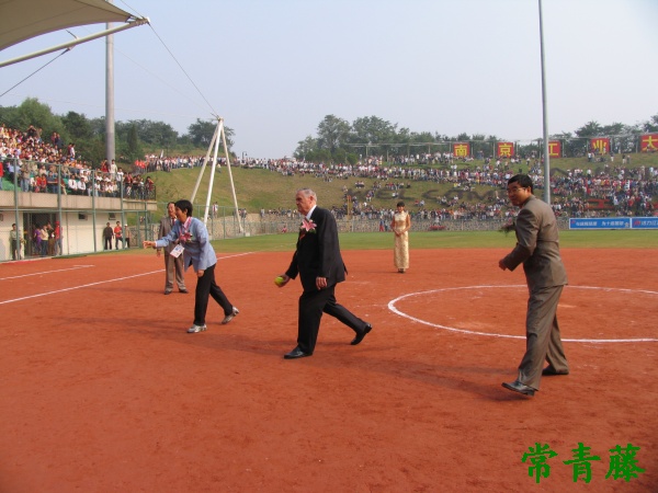 国家体育总局官员江秀云、国际垒 球联合会主席唐·波特、江苏省教育厅副厅长丁晓昌为比赛开球(江苏队与天津