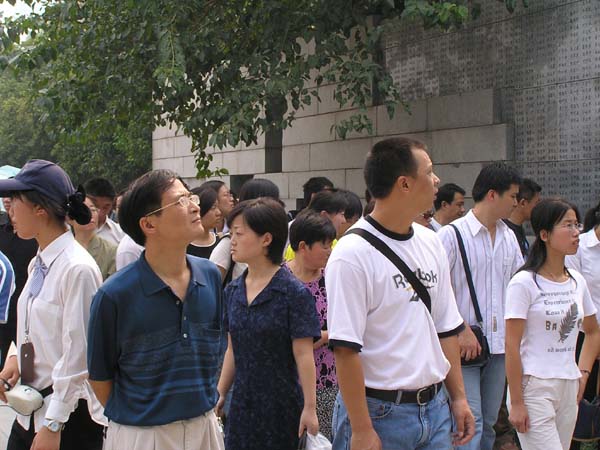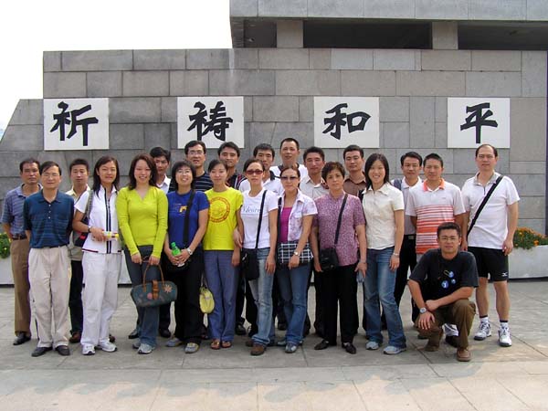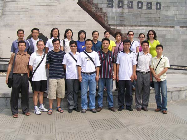 为纪念抗日战争胜利六十周年,结合公司正在进行的党员先进性教育活动,体育部党总支利用9月10日的第21个教师节,组织党员和入党积极分子参观了侵华日军南京大屠杀遇难同胞纪念馆。一行来到那庄严肃穆的纪念馆,看到正面石壁上刻有改革开放的总设计师邓小平亲笔题写的馆名和“1937.12.13-1938.1” 一行黑色大字,以及标明日军南京大屠杀的时间,中、英、日三种文字镌刻的一组黑色大字:“遇难者300000”,令人触目惊心。悼念广场有“警世钟亭”、“兴华宝鼎”、“《狂雪》诗碑”,有“历史的桥梁”、“残破城墙”和“断裂的军刀”3组建筑,以及“遇难者头颅”、“断臂”两组雕塑和长明火等主体设施。院内散置着13块记载着13处大屠杀主要遗址史实的石碑。遇难同胞遗骨陈列室呈棺椁形,陈列着由该处挖掘出的部分遇难同胞遗骨。旁边竖立着母亲像雕塑和刻有3000个遇难者名单的“遇难者名单墙”。大型墓室史料陈列厅,陈列着“侵华日军南京大屠杀暴行”专题史料,共展出400多幅日军现场屠杀照片、60多件实物和数十件档案资料等。大家听着讲解员的讲解,无不为侵略者残暴的罪行而愤怒,为悲惨遭遇深感悲痛,许多同志当场流下了热泪。