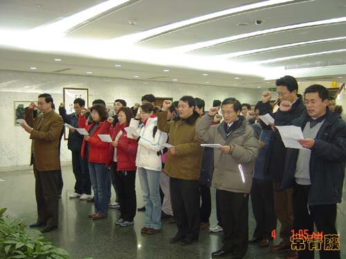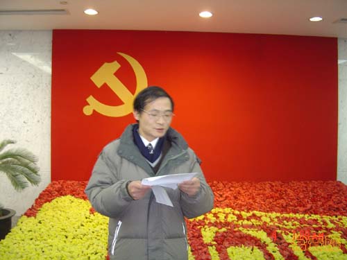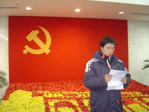 2005年元月4日至5日,体育部党、政、工、团组织在新年到来之际,联合组织了部全体党员、入党积极分子和部分教职工一行41人前往上海“中共一大会址”进行了参观学习。在一大会址前,直属党支部特地安排了四位新近被吸收入党的预备党员和全体正式党员一起,进行了入党誓言活动。在誓言仪式上,全体党员在体育部主任、支部委员王浩同志的带领下,面向鲜红的党旗,举起右手向党庄严宣誓:“我志愿加入中国共产党,拥护党的纲领……”,表达了全体党员的坚定地跟随党的坚强决心。体育部青年教师、新党员陈军同志代表支部预备党员发言,他回顾了在党组织的帮助和自己的不懈努力下,成为一名光荣的共产党员的经历,感谢党组织和全体党员的信任和鼓励,表达了入党以后更好地严格要求自己的决心。