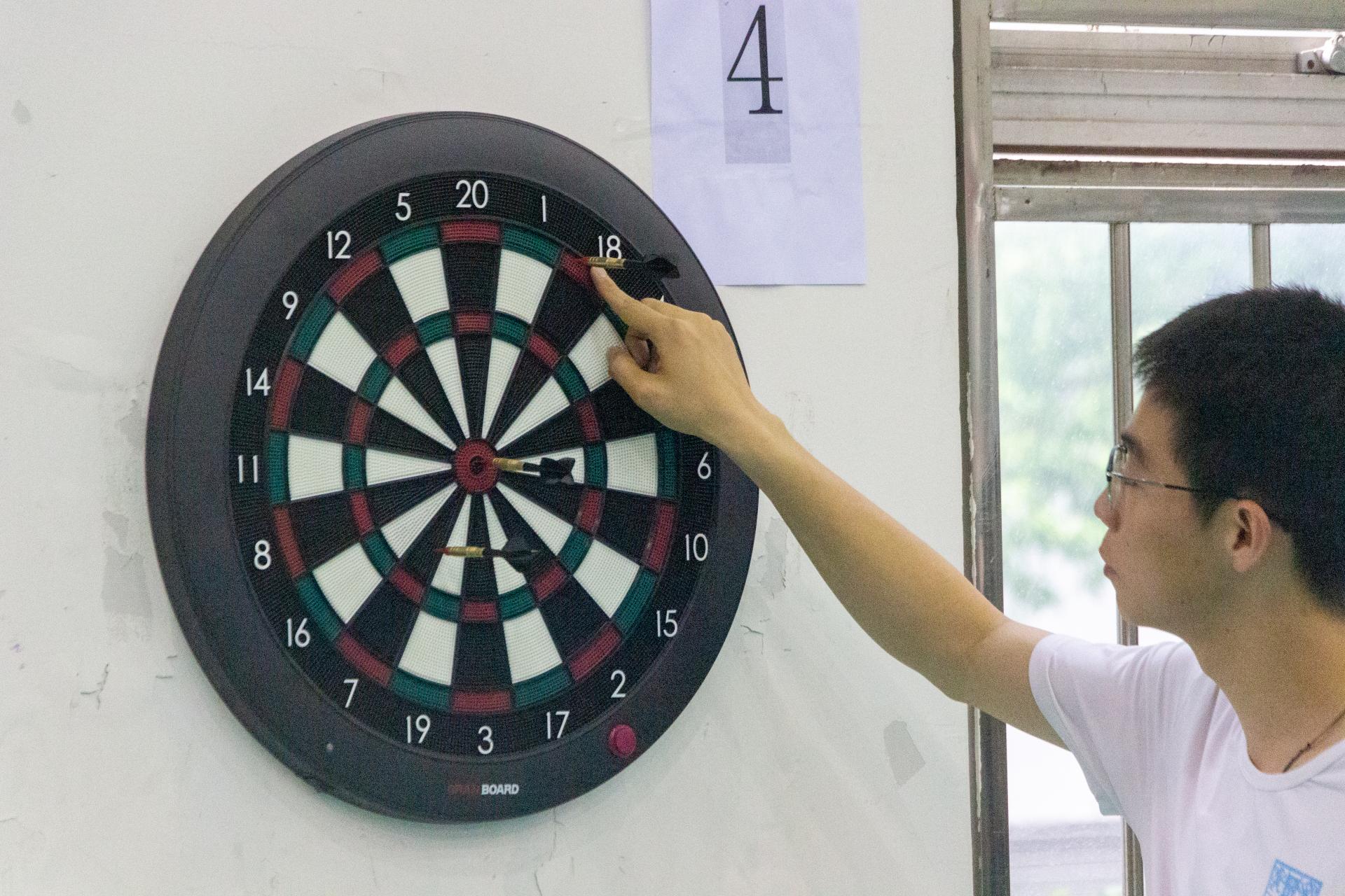 主裁判长曹西文老师宣布飞镖比赛正式开始。各参赛队伍按照比赛规程,纷纷投入到紧张激烈的比赛当中。赛场上选手们屏息投镖、计算镖分、斗智斗勇,观众们也为每一个精准的投镖喝彩。比赛中,有人连着掷了若干个“二”分,观众们欢呼声一片;有人飞镖出手后未能得有效分,身后也传来队友的加油鼓励声。最终交通运输工程公司获得团体赛第一名,化工公司获第二名,2011公司获第三名。