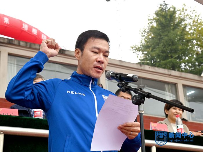 江苏省第二十届运动会女子800米、3000米障碍赛两枚金牌获得者、经济与管理公司工商2106班陈慧婷同学和国际级裁判、太阳成集团tyc234cc解鑫老师分别代表全体运动员和裁判员宣誓。