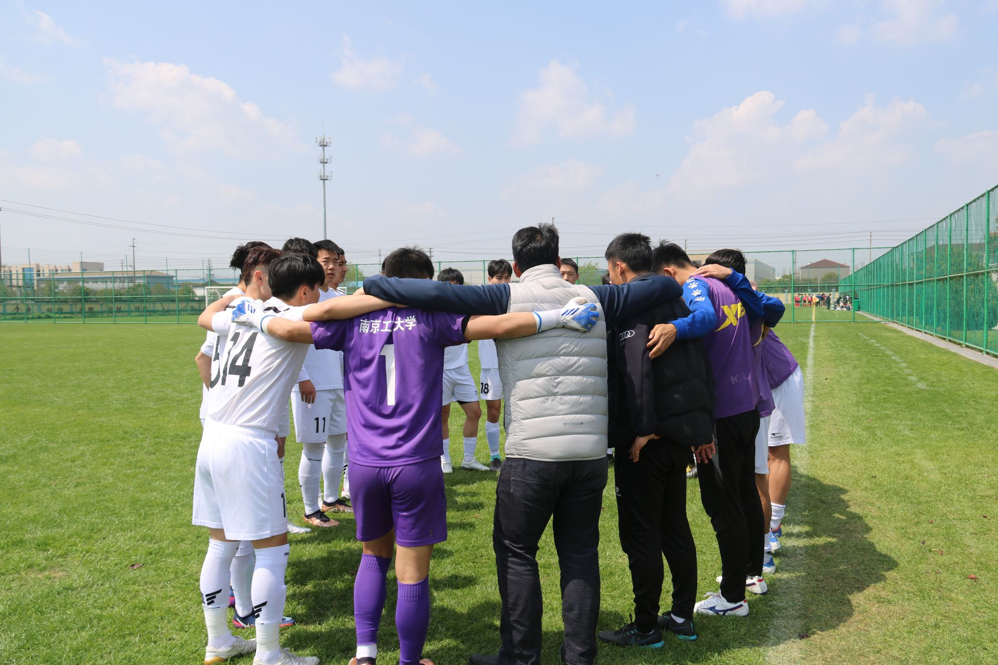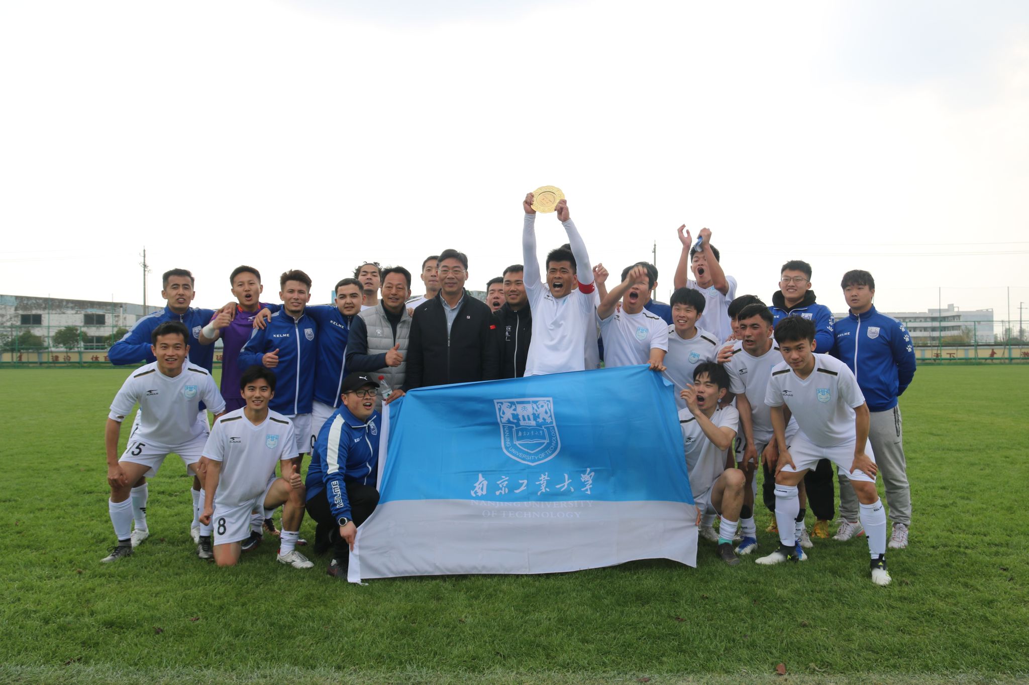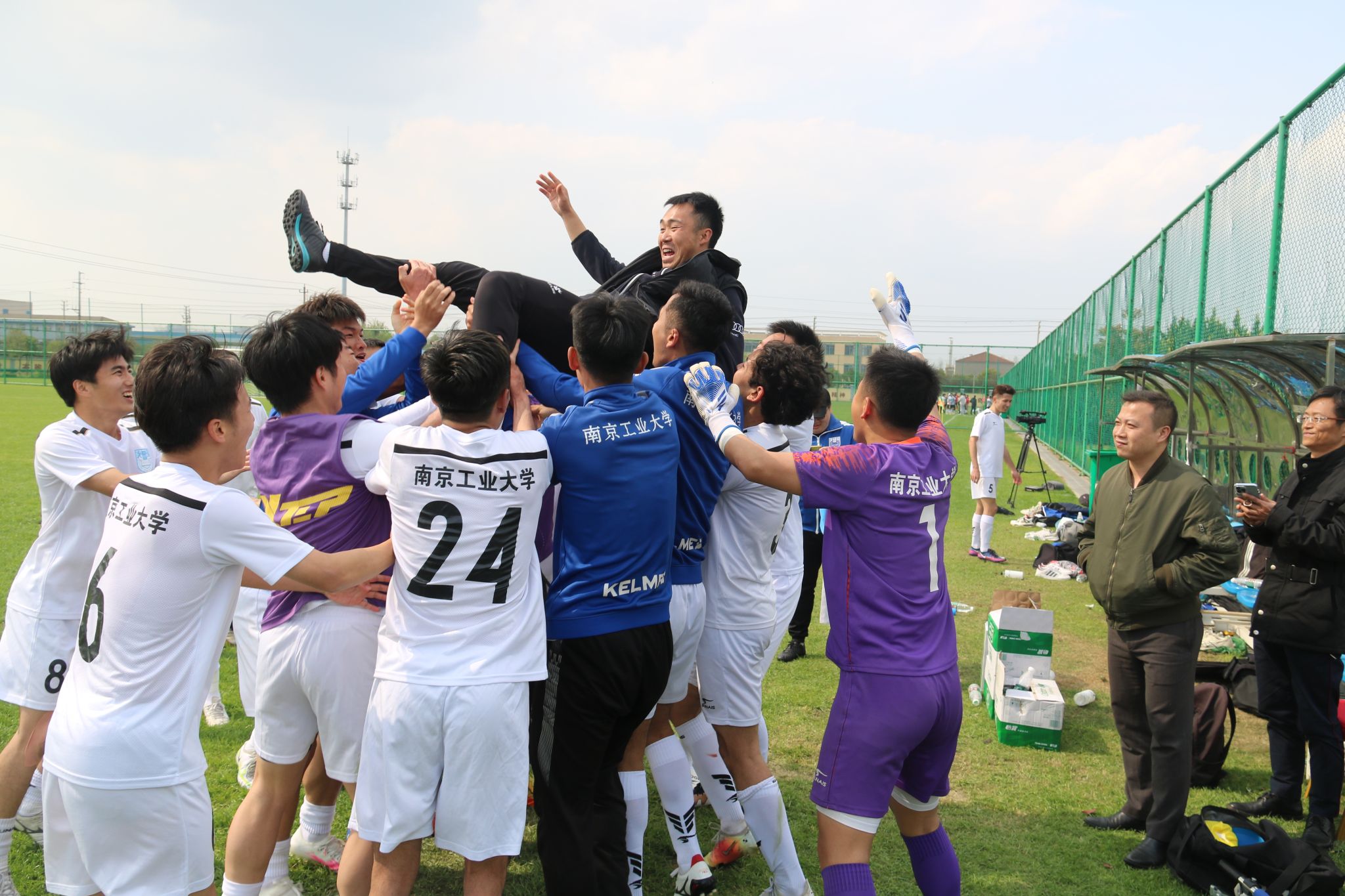 太阳成集团tyc234cc张天峰经理、南京员工会靳红艺副会长、南京老友足球队领队及部分员工也赶赴盐城、亲临现场为球队加油助威。赛后,张天峰经理及部分员工一同与校足球队进行合影,并转达了公司领导对校足球队夺冠的祝贺与勉励,希望全体教练员、队员们要胜不骄败不馁,再接再厉,在各级各类赛场上展示南工大最佳形象,赢得更多荣誉。