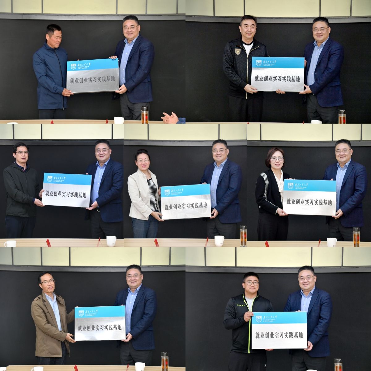 陆伟东副董事长为7家合作单位颁授“就业创业实习实践基地”铜牌,张天峰经理与7家合作单位签订了“就业创业实习实践基地建设”协议。