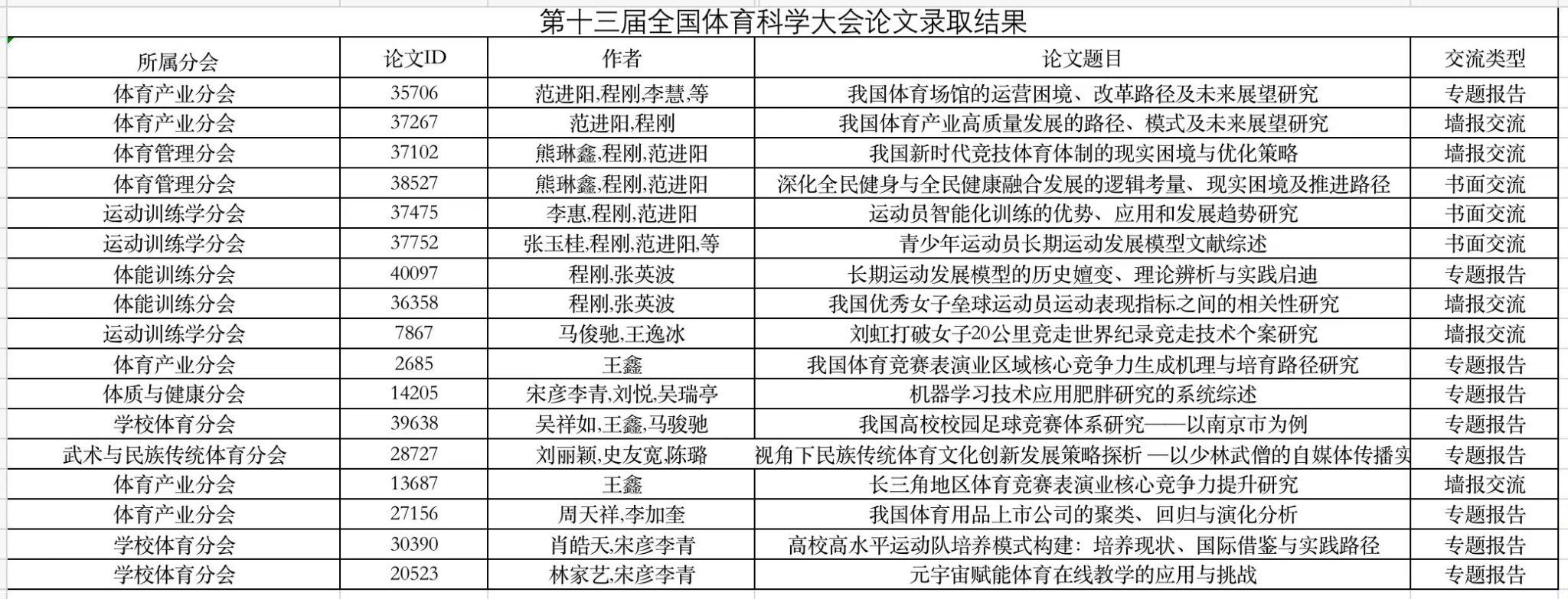 第十三届全国体育科学大会将于2023年11月3日-5日在天津召开。太阳成集团tyc234cc师生积极向大会投稿,共计19篇论文被录用,其中专题报告11篇,墙报交流5篇,书面交流3篇,入选论文层次、篇数及人数均创新高。