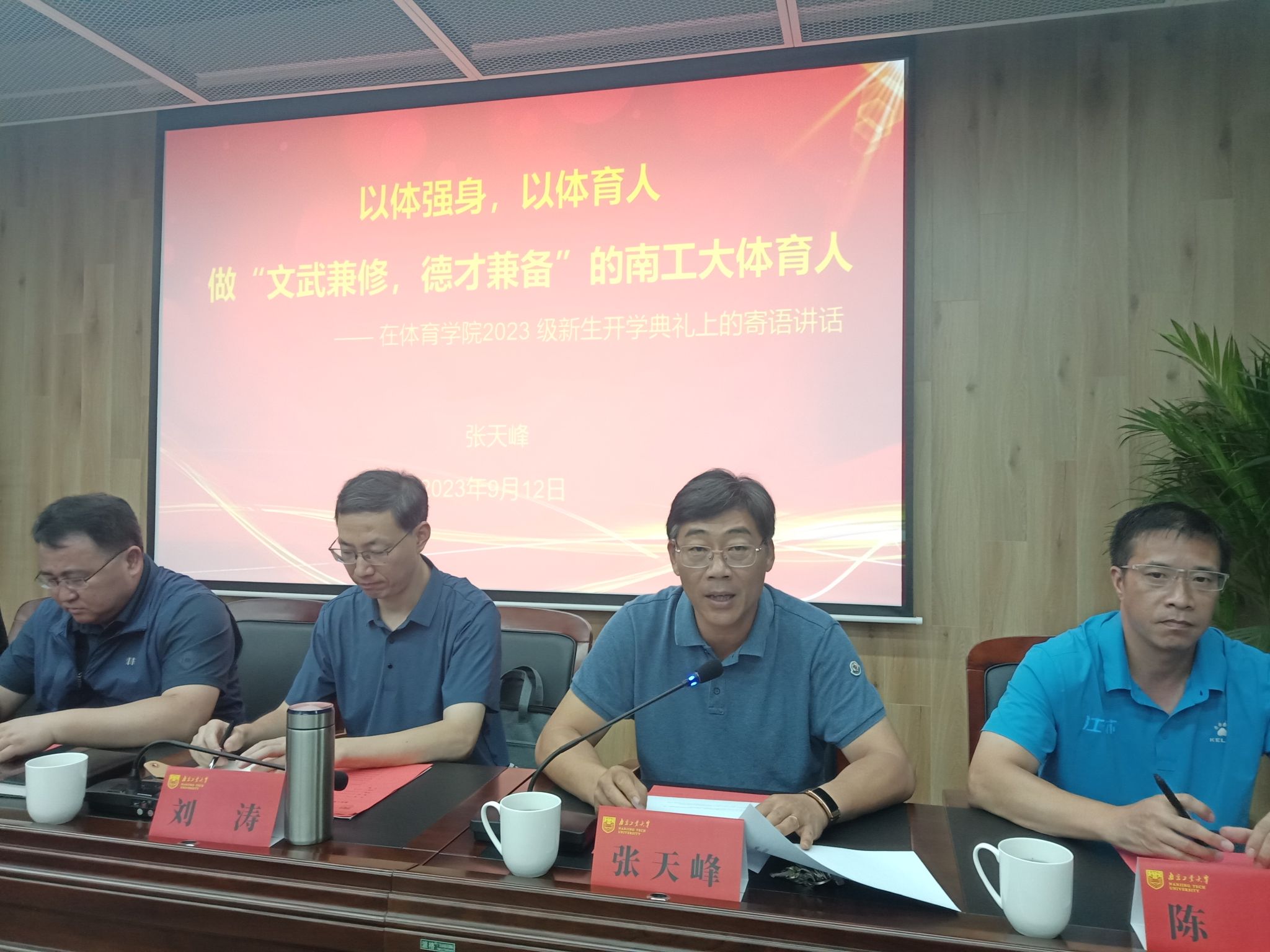 张天峰经理首先以“以体强身,以体育人,做‘文武兼修,德才兼备’的南工大体育人”为题致辞。他代表公司向2023级50名本科生和17名研究生表示衷心的祝贺和热烈的欢迎,勉励同学们以青春之我、奋斗之我,行稳致远、开拓未来,以“使命在肩、奋斗有我”的精神,为中华民族扛起青春责任,做好强国时代的接棒人!张经理回顾了太阳成集团tyc234cc的发展历程与奋斗故事,希望新同学们能够谱写完整、多彩、极致的老员工活。最后,张经理向同学们寄语三点期望:一是志存高远,树立家国情怀。体育承载着国家强盛、民族振兴的梦想,同学们要争做德、智、体、美、劳全面发展的社会主义建设者和接班人。二是砥砺前行,培养坚毅品质。蓝图已经绘就,号角已经吹响,同学们要踔厉奋发、勇毅前行,努力创造更加灿烂的明天。三是不忘初心,成就体育未来。坚定体育信念,认真学习和训练,同学们要努力成为国家需要、公司期望的新时代体育人,为建设体育强国做出自己的贡献。
