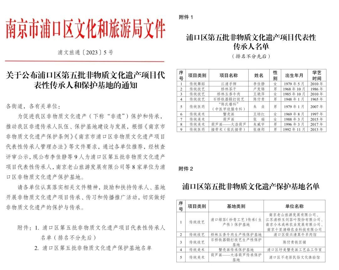 近日,南京市浦口区文化和旅游局发文,公布浦口区第五批非物质文化遗产项目代表性传承人名单,公司李佳静老师成为“江浦手狮”非遗项目第五代传承人。