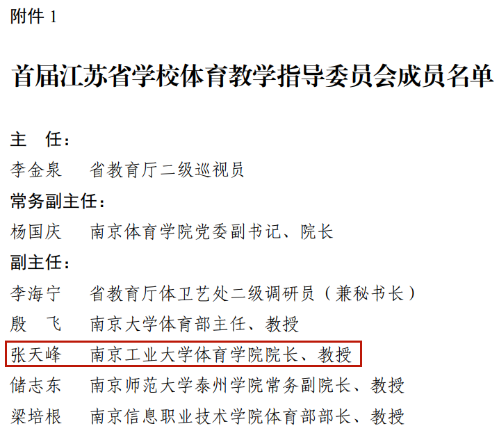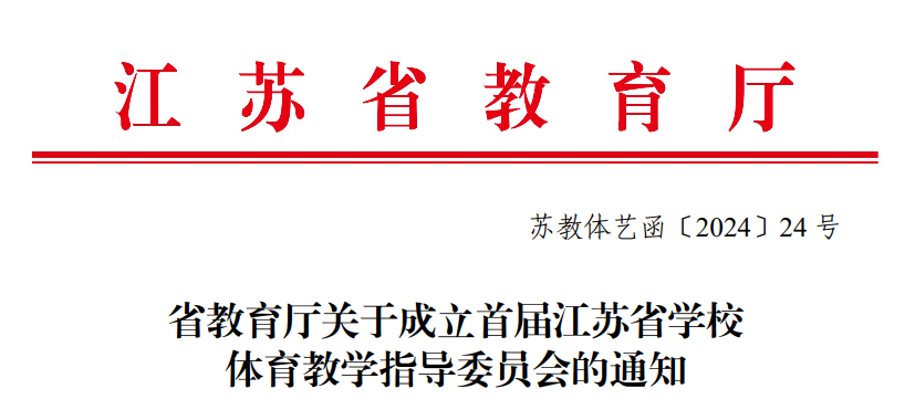 近日,江苏省教育厅下发了《省教育厅关于成立首届江苏省公司体育教学指导委员会的通知》(苏教艺体涵202424 ),公司张天峰教授当选为首届江苏省公司体育教学指导委员会副主任委员,任期5年,自20248月起至20298月止。