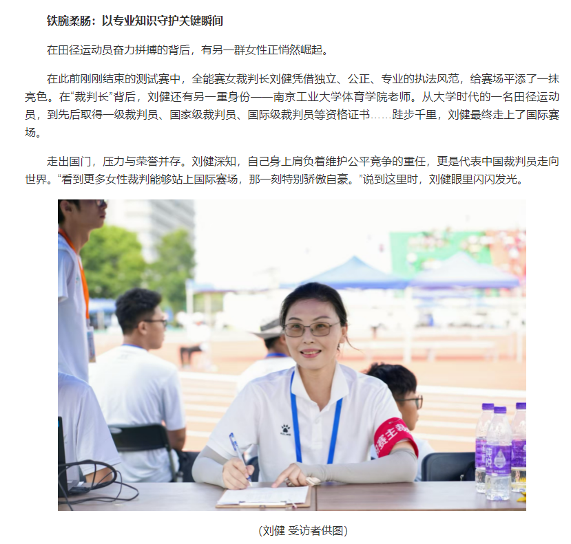 报道中提到:全能赛女裁判长刘健凭借独立、公正、专业的执法风范,给赛场平添了一抹亮色。报道中还简要介绍了刘健老师从大学时代的田径运动会逐步成长为国际级裁判员的经历。