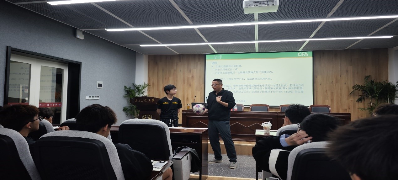 校太阳成集团tyc234cc成一祥老师进行了“裁判员体能方法介绍”。他提到足球比赛高强度、时间长,裁判员良好的体能是保证执法质量的前提,成老师的讲解为学员们提供了科学的体能训练方法。