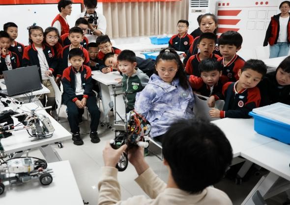 “医生通过操作机械臂就可以进行远程手术”,“智能小车能够在高温作业、灾区抢险等危险或难以完成的工作中替代人类,降低风险。”听着Vistalab实验室成员一边展示着作品,一边向小员工们讲解,小员工们纷纷迫不及待地进行操作体验。“我们希望通过沉浸式体验,让小朋友们切实感受人工智能技术对生产生活的改变,感受科技力量和时代之变。”志愿者穆逸霖说道。