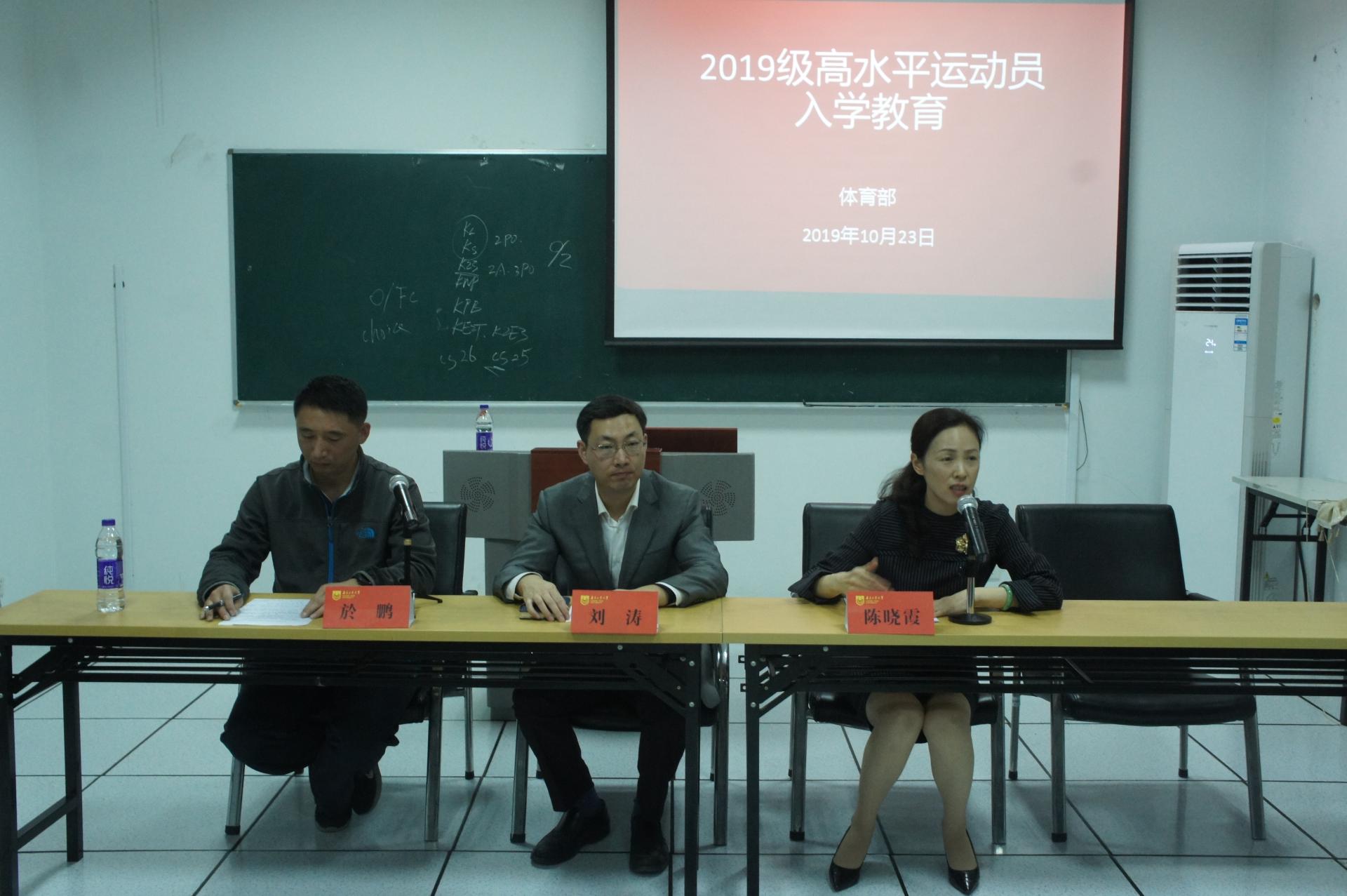 10月23日下午,在江浦校区体育综合馆多媒体教室,公司召开了2019级高水平运动员入学教育会,校教学事务部学业事务科科长皋春、体育部党总支书记刘涛、副主任陈晓霞,高水平运动员指导教师代表於鹏、李海兵、曹婧,全体2019级高水平运动员参加了本次会议。会议由於鹏老师主持。