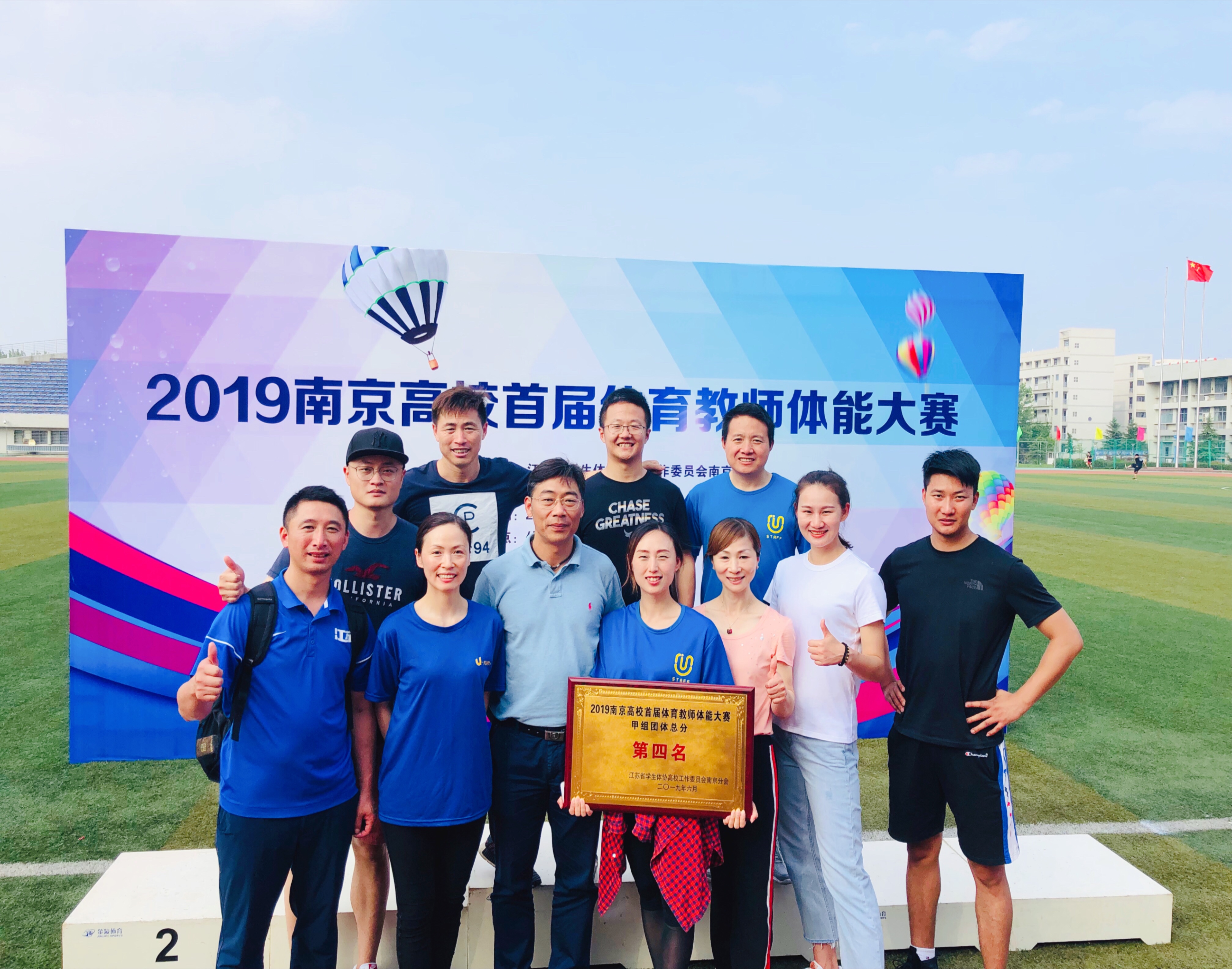 2019南京高校首届体育教师体能大赛于2019年6月22日在南京邮电大学仙林校区圆满落幕!公司体育部在陈晓霞老师带队下,杜寿高、茆登华、於鹏、贡新烨、王佳玥、程刚、张继鹏、沈雨、王小飞老师参赛。老师们克服运动伤病,在体育赛场上发扬拼搏精神,精诚合作!最终公司体育部获得团体总分第四的好成绩!
