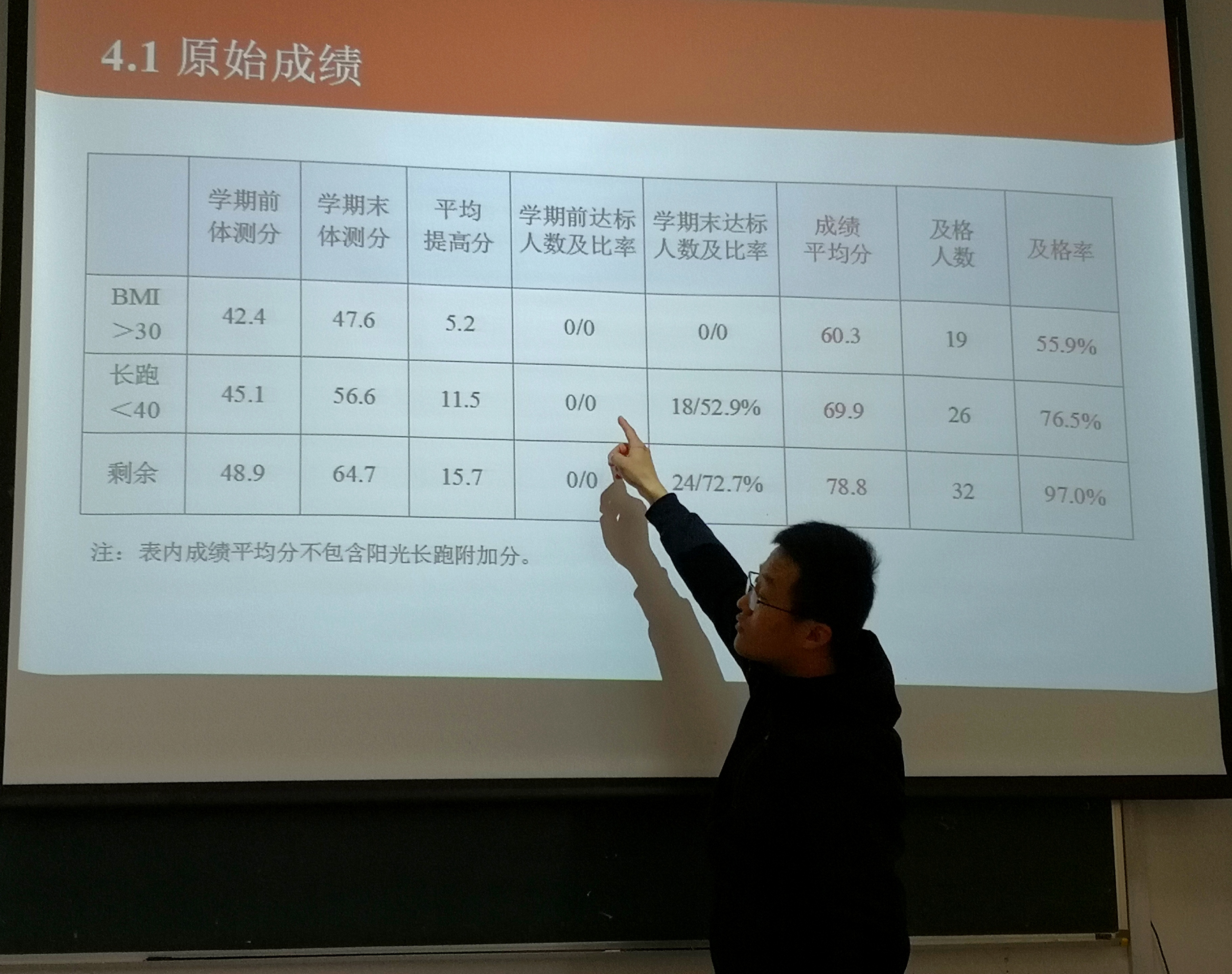 副主任陈晓霞老师开篇回顾了公司体弱生体能强化班的发展概况,在总结以往教学经验基础上,针对体能强化班教学过程中存在的突出问题作出答疑和解决路径指引。程刚老师结合过去一年的教学实践,以PPT形式从体弱生筛选原则、强化班分班依据、教学时长安排、考核方式及成绩评定方法和注意事项等五个方面展开介绍,并系统分析了2017-2018学年体弱生体能强化班成绩,提出优化课程成绩评价标准的具体方案。颜耀春和胡琴老师分别就教学目标、教学内容、教学方法、负荷安排、负荷量度监控以及教学过程中的注意事项等方面教学经验进行了分享。会议最终修订了本学期体弱生体能强化班课程的具体实施方案。