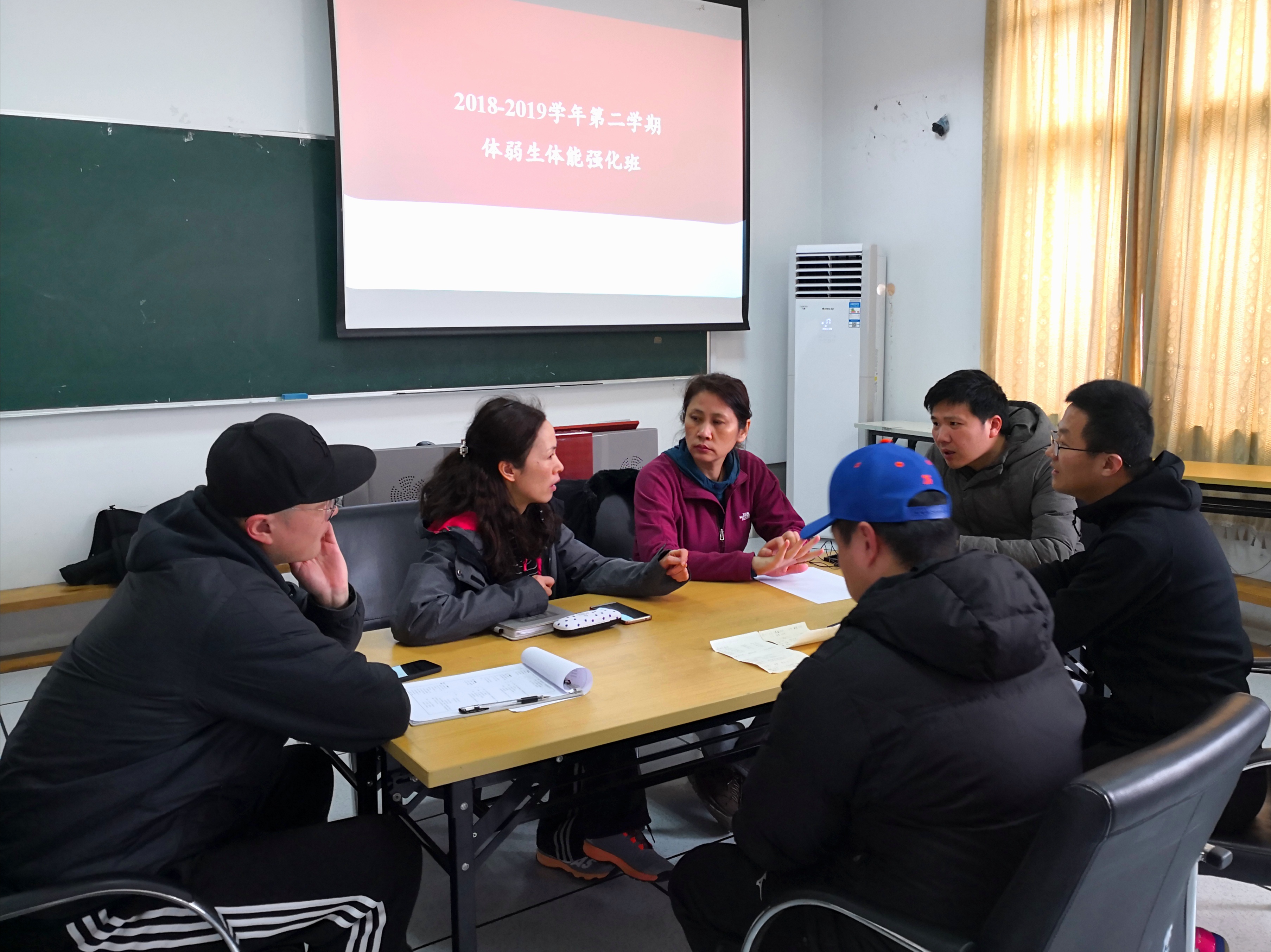 为全面强化公司体育工作,进一步深化公司体育改革,提高体弱生的体质健康水平,2019年3月1日(周五)中午12:30,体育部组织体弱生体能强化班教学团队成员在综合馆三楼会议室召开了 2018-2019学年第二学期体弱生体能强化班专题研讨会。体育部副主任陈晓霞、以及团队成员颜耀春、胡琴、孙景召、程刚、张继鹏和解涛瑞六位老师参加了会议。