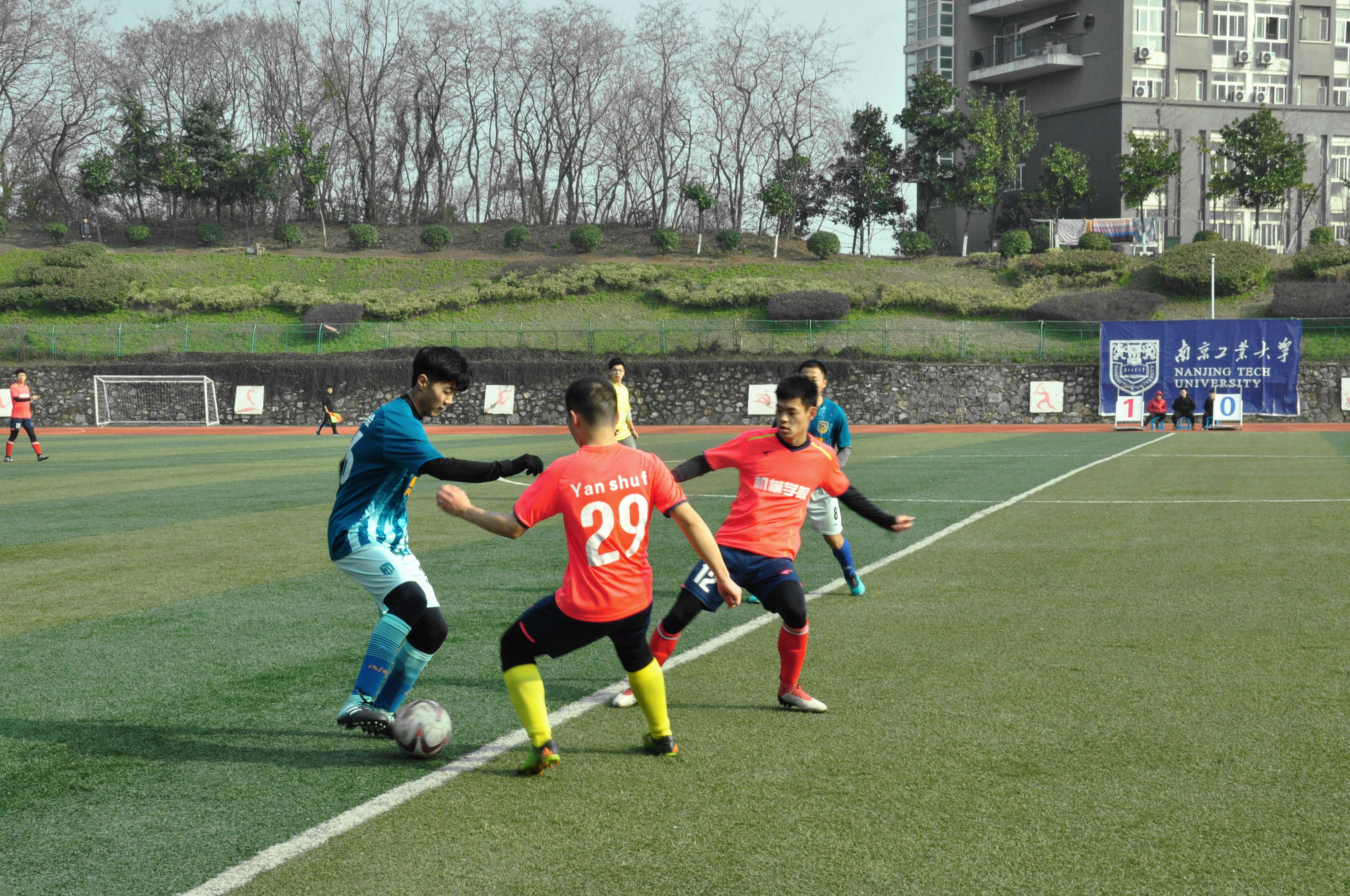 上午出场的是经管测绘联队与机械安全联队。双方球员很快进入状态,机械安全队率先进球打开局面,上半场结束,机械安全联队1:0领先,经管测绘联队并未放弃,一直奋力反击。经过中场的休息调整,下半场经管测绘联队攻势凌厉,不断进球,最终追回并反超比分。经管测绘联队凭借队员默契的配合和永不放弃的决心以3:2成为本届足球联赛的季军,机械安全联队惜败获得第四名。