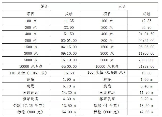 (五)田径高水平运动员考生小项报名起点成绩要求如下: