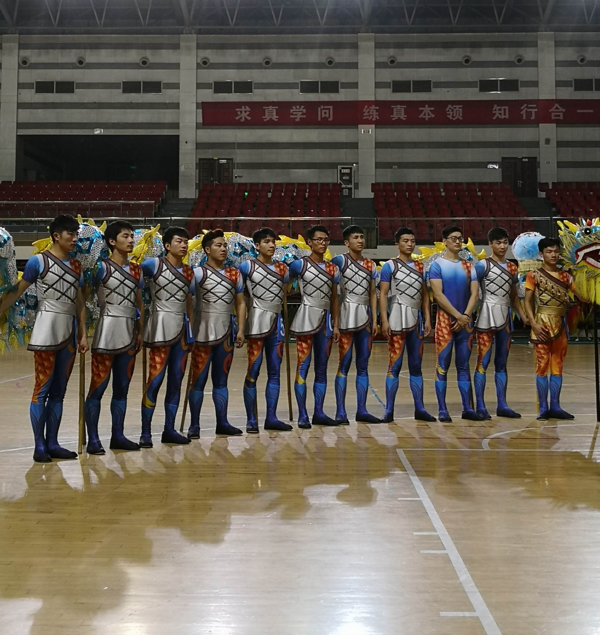 龙队同学同样也无比辛苦,做一套组合练习平均时间是9分钟,运动量相当于我们一般人快跑了3500米,这样的练习每次课都要重复三次甚至更多,“躺地滚8字舞龙”一个动作下来,地板上面全部是同学衣服上湿漉漉的汗渍,如同澡堂的地面,脱下衣服拧一下,全是水、水、水........。