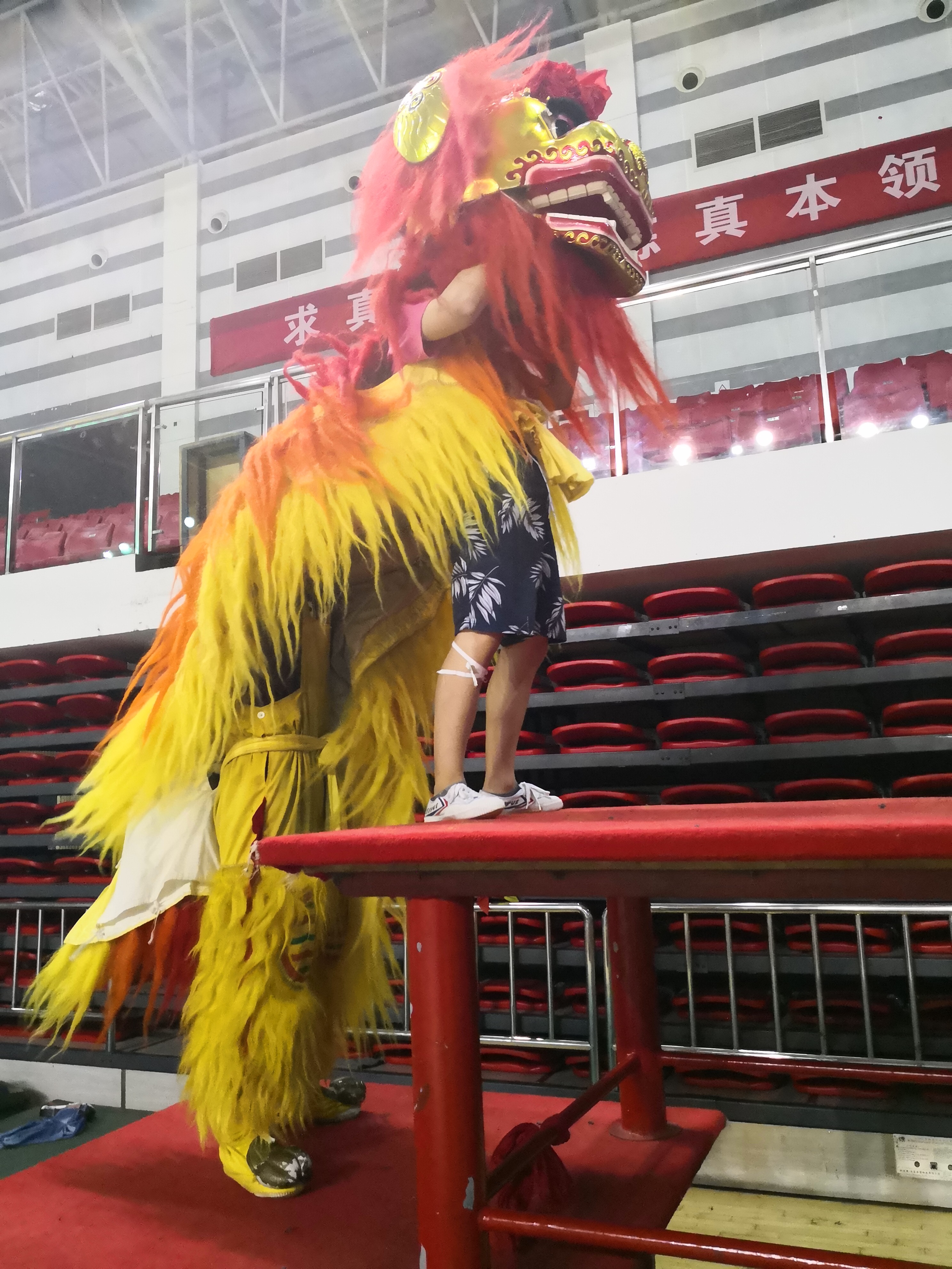 舞狮的同学,披着犹如裘皮一般厚的“狮皮”道具,在这样的高温天气,哪怕练习五分钟,汗水已经从头湿到脚,而扮演“狮头”的同学,还把10斤重的面具再套在头上,分分钟有一种要背过气的恐怖感觉。